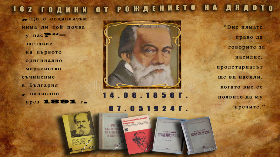 Димитър Благоев е български политик и философ, основател на организираното социалистическо движение в България и на първата социалдемикратическа партия на Балканския полуостров. Той използва марксистки идеи в статиите си предлага идеята за организиране на работническата класа и за придаване на политически характер на борбите й.