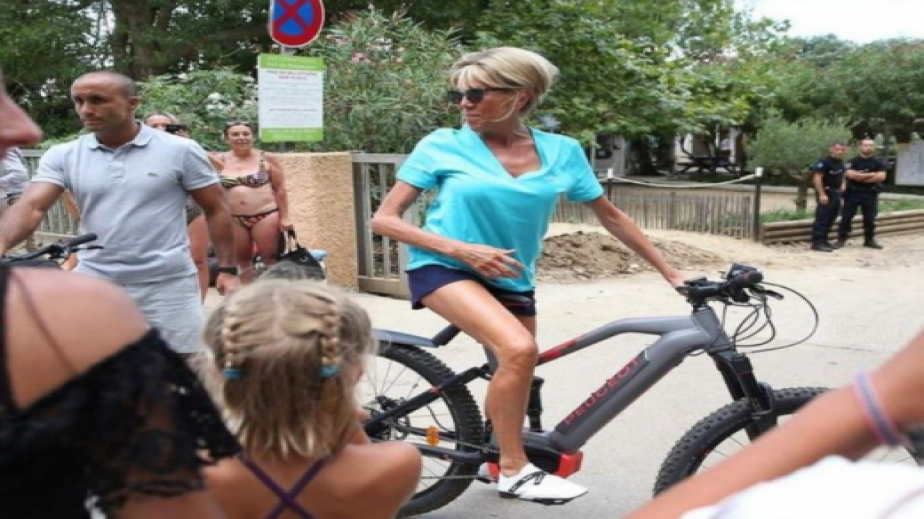 65-годишната първа дама на Франция възхити със стегнати крака. Г-жа Макрон бе избрала къси тъмносини панталонки, с които прикова вниманието на туристи. Бриджит, която е запалена по колоезденето, бе заснета в близост до резиденцията в Брегансон.