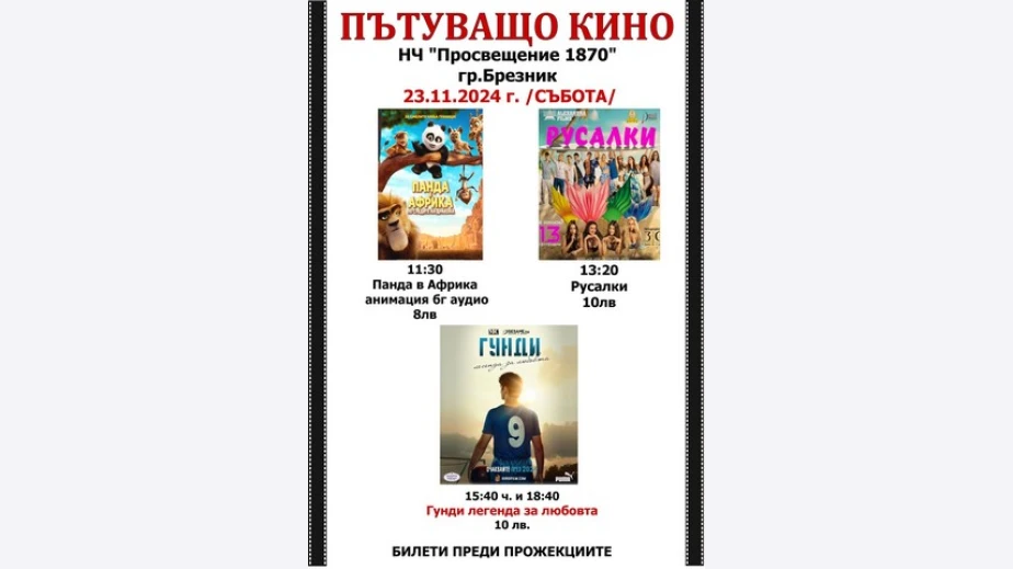 От 11.30ч., в читалището на града ще се прожектира и анимационния филм „Панда в Африка“. Стойността на билетите за него е 8 лв .