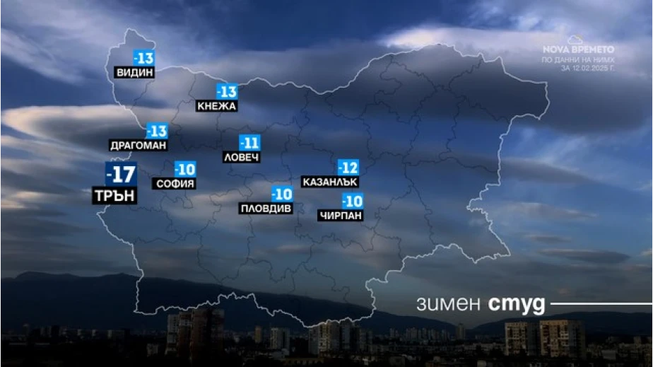 Най-ниската температура за годината (в населено място в ниската част на страната) е била отчетена днес в Трън, съобщи Нова ТВ. При ясно време и лек североизточен вятър в ранните часове на 12 февруари термометрите в метеорологичната станция са показали минус 17 градуса. В Драгоман, Видин и Кнежа по същото време уредите са измерили минус 13 градуса. От планинските станции най-ниската стойност е отчетена на връх Мусала - минус 16 градуса.