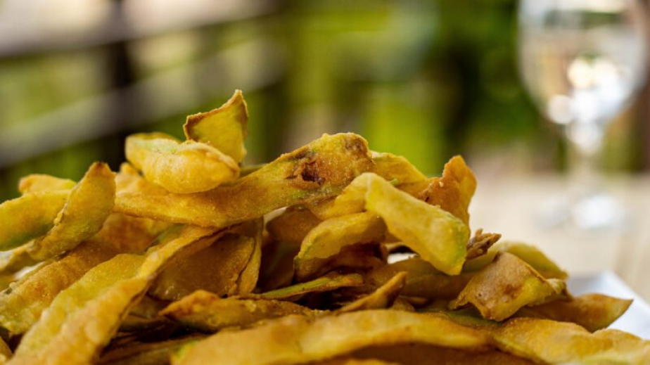 Другата половина с тиквички върнете в хладилника. Сгорещете олио в дълбока тенджера. Оваляните тиквички потапяйте в ледената вода и пържете на средна, умерена степен за няколко минутки до златисто.