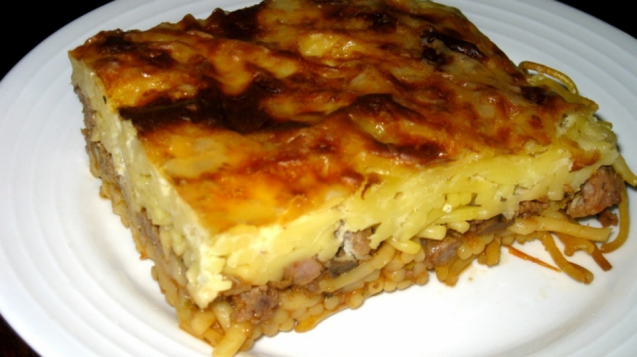 Изсипете 1/2 от пастата. Покрийте с доматения сос. Отгоре изсипете останалата паста и залейте с бешамела. Печете ястието на 180 градуса за 30-40 минути. В края на печенето поръсете с кашкавал. Върнете във фурната, докато се разтопи и придобие приятен загар.