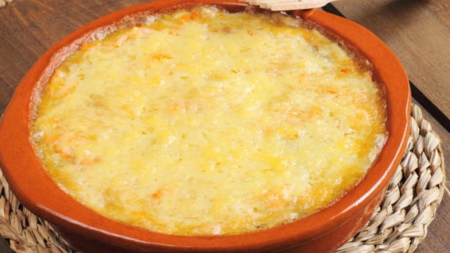 Настържете кашкавала на по-едро ренде, а ако използвате сирене, го намачкайте.Разбийте юцата с млякото и брашното и добавете кашкавала. Овкусете с черен пипер и малко сол по желание.Обърканата смес сипете в намаслена тава и сложете да се изпечете до готовност в умерено загряна фурна.