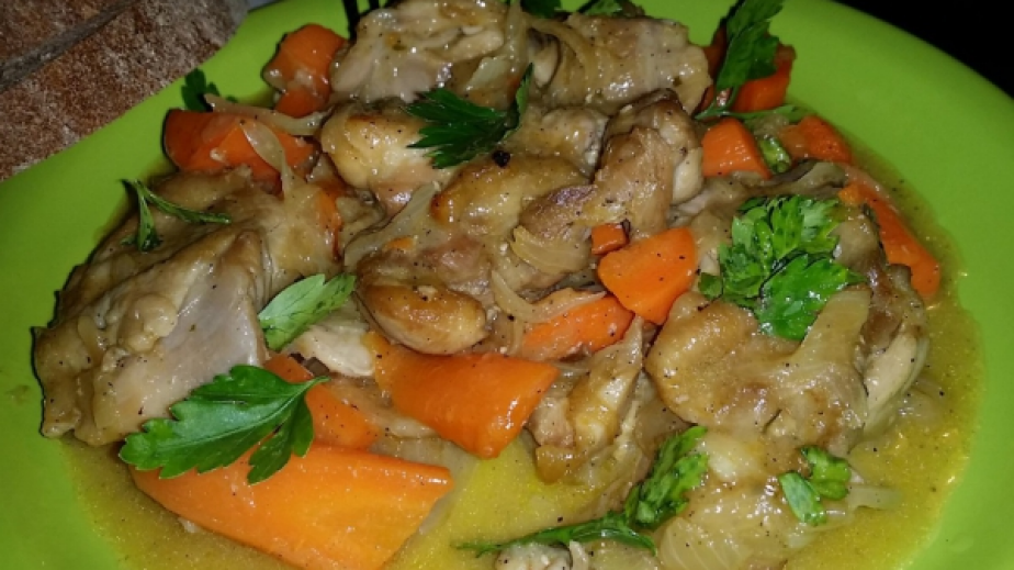 Махнете го в чиния и в същата мазнина сложете лука и сварените моркови. Пържете до златисто, добавете пилето и бульона, разбъркайте, така че да оберете всичко, което се е захванало на дъното.