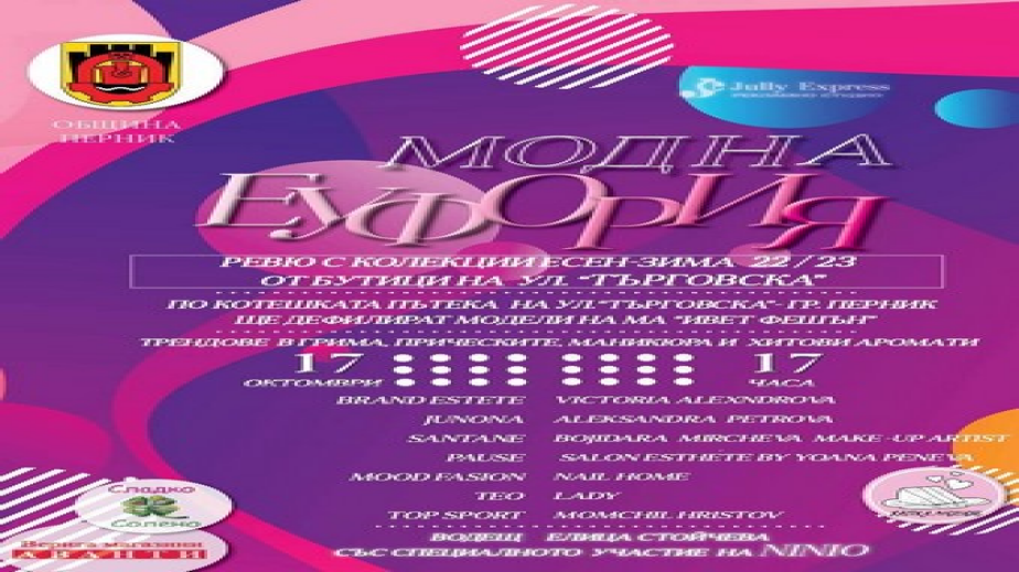 В 17:00 ч. днес ул. „Търговска“ ще се превърне в моден подиум. „Модна еуфория“ ще завладее центъра на града с ревюто на колекции есен-зима 22/23 на бутици от търговската улица. Проявата по повод деня на града се организира от рекламно студио „Jully Expres“, със съдействието на Община Перник. По котешката пътека ще дефилират модели на „Ивет Фешън“. Те ще представят колекциите на седем бутика от „Търговска“ и две млади пернишки дизайнерки – Виктория Александрова и Александра Петрова. От 16:00 ч. ще бъдат представени трендове в грима, прическите, маникюра и хитови аромати. Водещ на събитието ще бъде Елица Стойчева, специално участие в празника на модата с акустичен концерт на китара ще вземе Ninio.