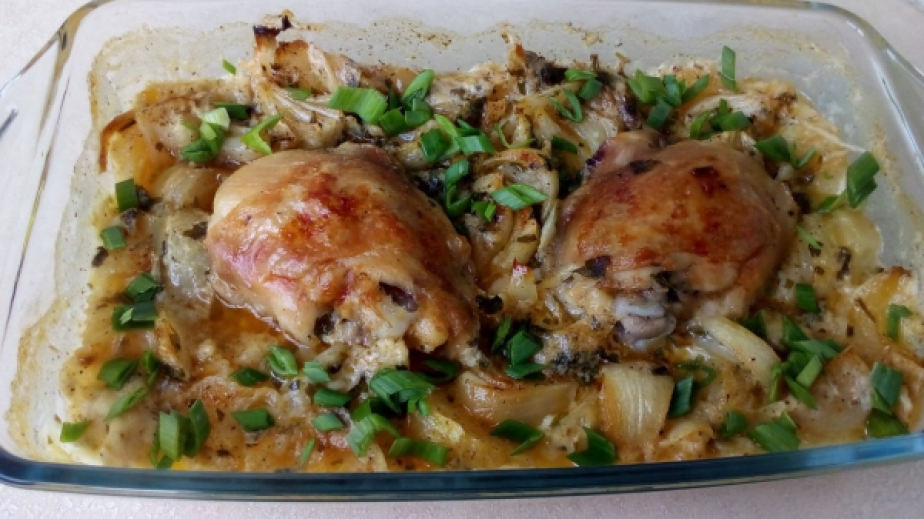След като пилето се е позапекло, изваждаме тавичката от фурната, изваждаме месото в една чинийка и изсипваме лука и подправките в тавичката, прибавяме и маслото и след това слагаме върху лука месото, връщаме обратно във фурната.