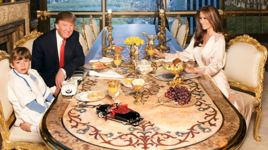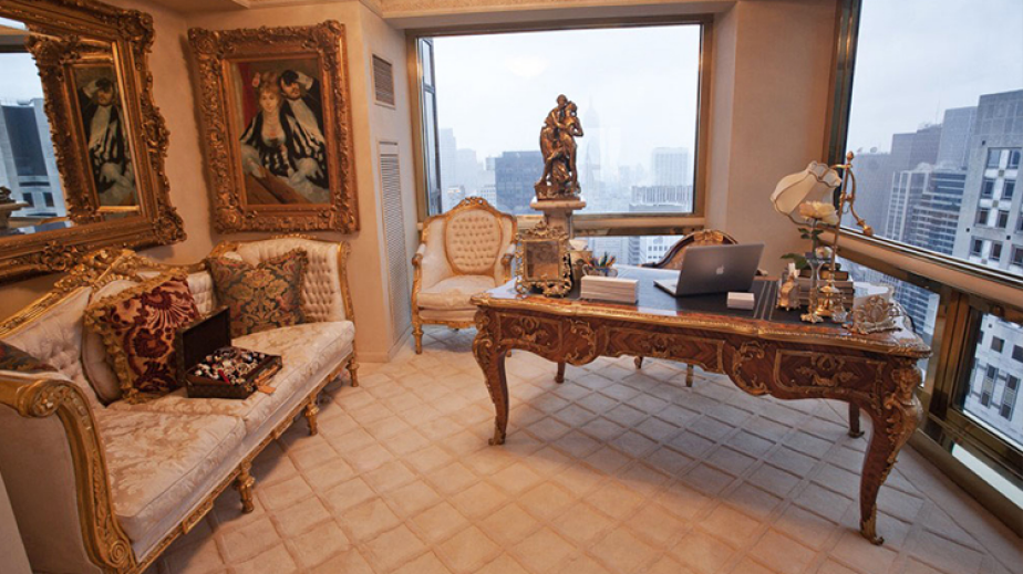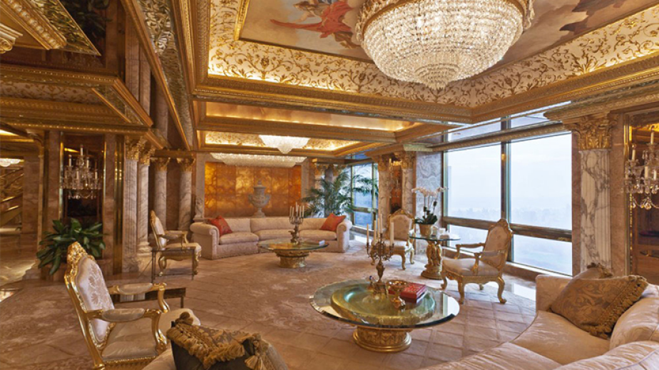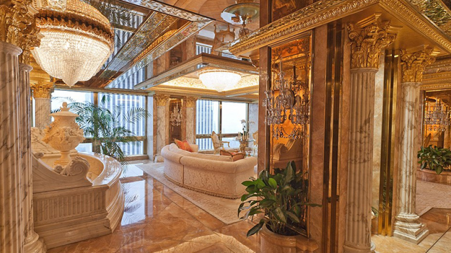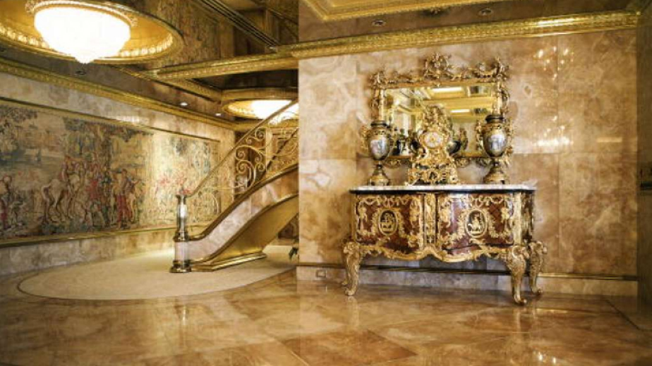 Доналд Тръмп се шири в мегалускозен мезонет. Който е буквално като изваден от някоя ренесансова история. Тъй като във всяка една стая от него, дори и в тоалетната, се вижда невероятен разкош – злато, диаманти и тежки, луксозни мебели по поръчка.