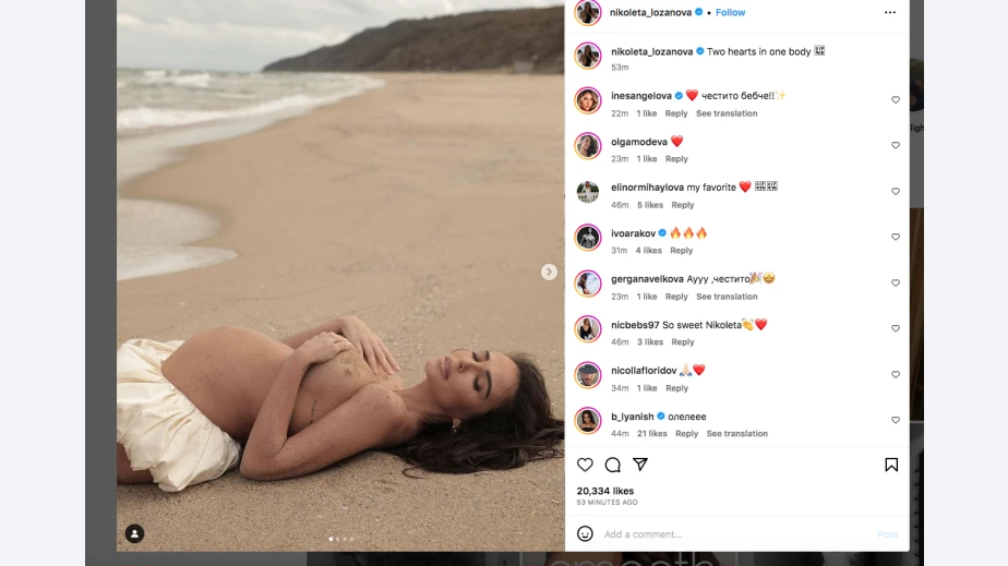Плеймейтката Николета Лозанова е бременна от вратаря на „Левски" Николай Михайлов, видя първо Lupa.bg. От снимката става ясно, че красавицата е в напреднала бременност. Ни Ло има една дъщеря – Никол, но тя е от Валери Божинов.