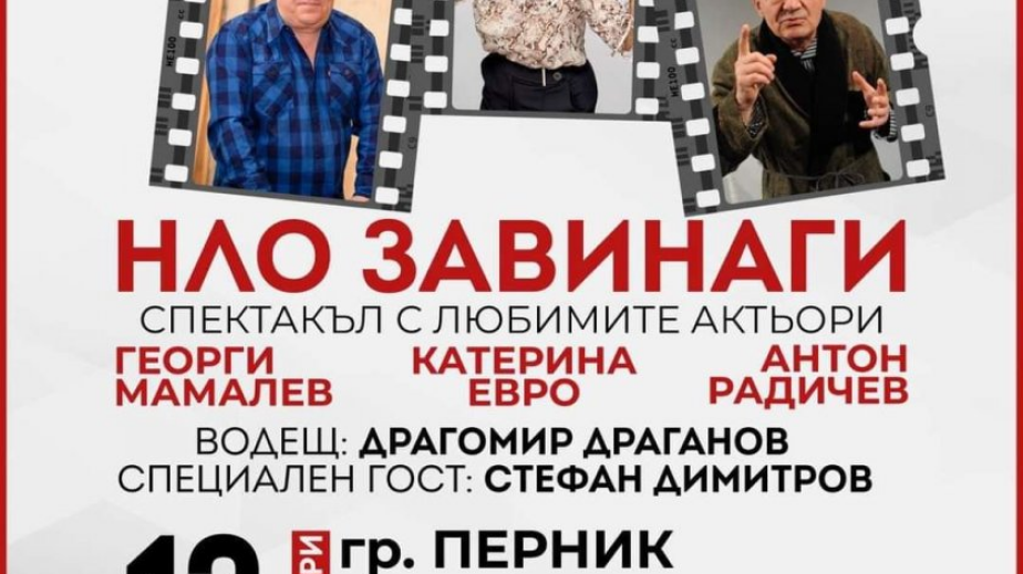 Едни от най-успешните и обичани български актьори ще си дадат среща в лятното кино в града от 20:00 ч. Сред тях са актьорите Георги Мамалев, Антон Радичев и Катерина Евро. Те ще припомнят емблематични песни, скечове и ще разкажат спомените си от несъществуващото вече телевизионно предаване "Клуб НЛО".