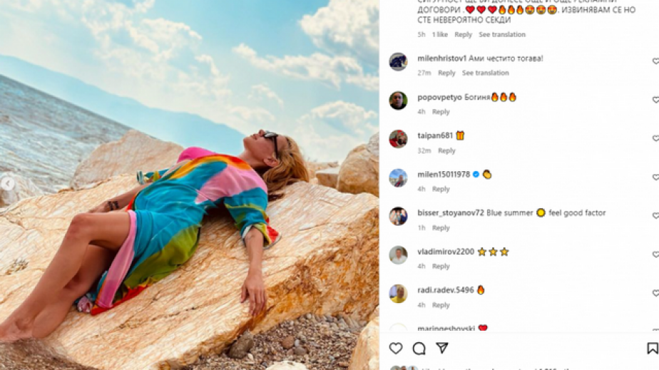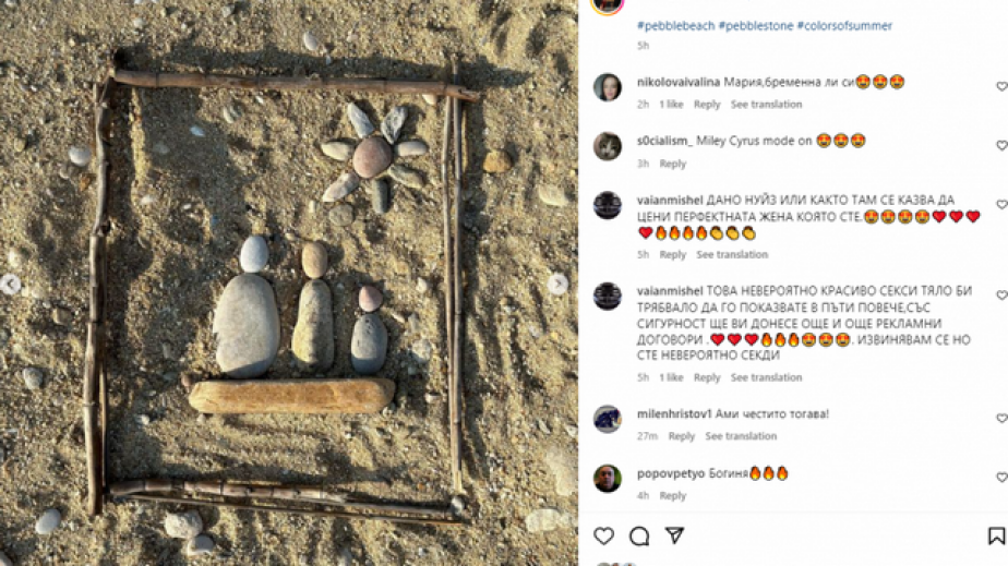 Красивата блондинка се щракна в много цветен бански и туника от плажа, разбира се, в секси поза. На един от кадрите обаче Игнатова е показала каква картинка от камъчета е наредила - а именно - мъж, жена и малкото им дете. Дали в случая става дума за бебе на хоризонта, много скоро ще стане ясно.