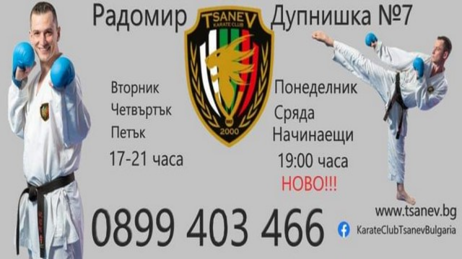 В град Радомир вече има Център за развитие на млади таланти - карате клуб "Цанев", който се намира на ул. "Дупнишка" № 7. Новооткритата зала за карате работи всеки ден и в нея могат да тренират деца от 4 до 8 години в профилирани групи. Понеделник и сряда от 19 часа, както и вторник, четвъртък и петък от 17 часа.