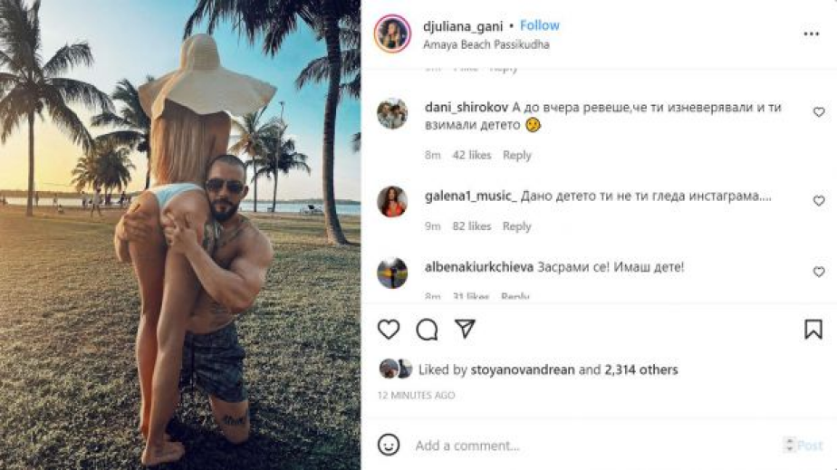 Татуираният мачо официално се показа в Инстаграм профила на Гани, като даде да се разбере, че той е този, който мачка сочните й форми. Под снимката обаче заваляха куп негативни коментари с адекватни критики. "Зов за внимание... тъжна гледка", "А до вчера ревеше,че ти изневерявали и ти взимали детето", "Дано детето ти не ти гледа инстаграма….", "Засрами се! Имаш дете!", "Пластмасата как е на пипане" са една малка част от упреците към риалити фурията. Много от тях обаче са изтрити собственоръчно от Джулката, става ясно от коментиращите. "Браво, Джулка! Печелиш награда за най-скоростно триене на коментари. Изключи ги, миличка, недей да се тормозиш да триеш един по един."
