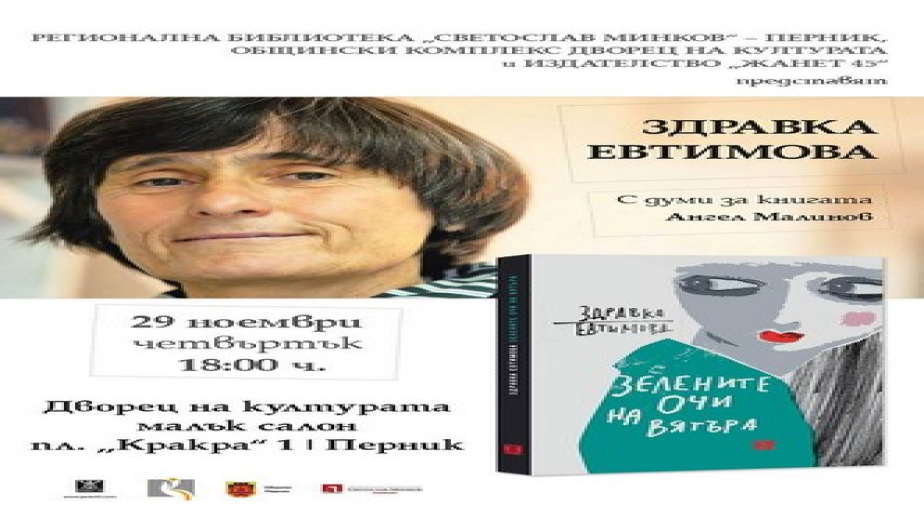 Най-новият роман на Здравка Евтимова- „Зелените очи на вятъра” ще има своята премиера в Перник на 29-ти ноември от 18 часа в Малкия салон на Двореца на културата. Организатори са Регионална библиотека „Св. Минков”, ОК Дворец на културата и издателство „Жанет 45”.