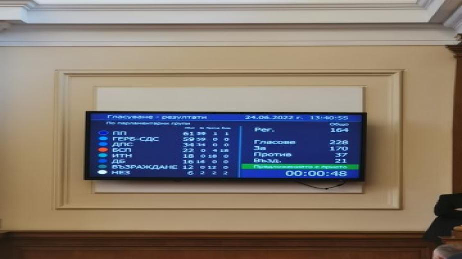 Депутатите приеха френското предложение със 170 гласа “за”, 37 “против” и 21 “въздържали се”. Позитивен вот дадоха 59 депутати от "Продължаваме Промяната", още толкова от ГЕРБ-СДС, 34 - от ДПС, 16 - от ДБ и двама независими. "Против" бяха един представител на ПП, четирима от БСП, 18 от ИТН, 12 от "Възраждане" и двама независими. Въздържаха се 18 народни представители от левицата, един от ПП и двама независими.