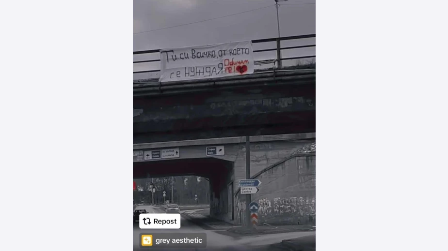 Нестандартен начин да се обясни в любов е избрал някой към своята половинка. Надписът „Ти с всичко, от което се нуждая! Обичам те!“ се развя на моста на кръговото в квартал „Изток“ в Перник. Белият транспарант и цветния надпис са видими за всички пътуващи от най-големия квартал на града.