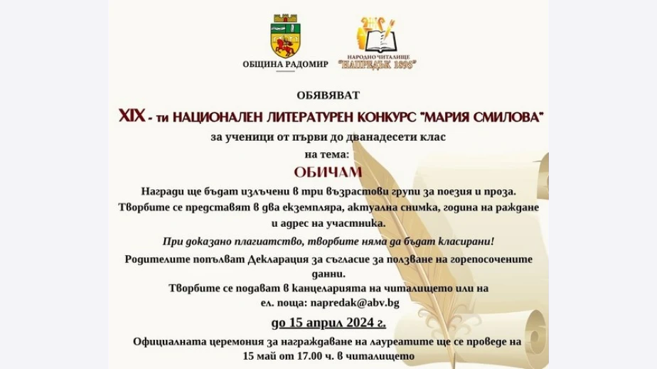 Община Радомир и Народно читалище”Напредък 1895” гр.Радомир за XIX- ти път обявяват Националния литературен конкурс”Мария Смилова” за ученици от първи до дванадесети клас на тема Обичам.