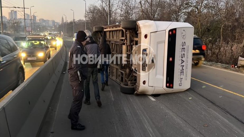 Трафикът на местопроизшествието е затруднен, а автобусът ще бъде преместен. По информация на NOVA водачът е пострадал леко, а в катастрофата не са участвали други превозни средства.