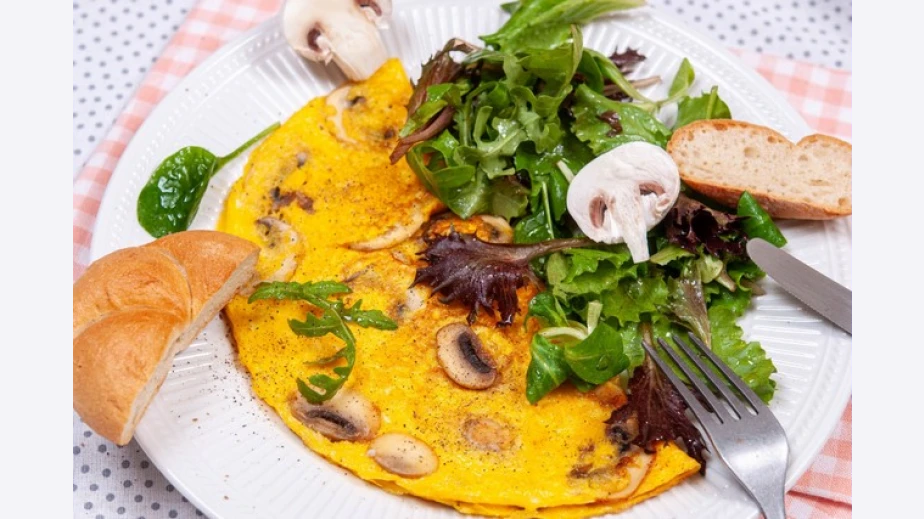 Първата стъпка от рецептата за омлет с гъби е подготовката на продуктите. Яйцата разбивате в купичка с около ½ чаена лъжица сол и черния пипер. Измивате гъбите и ги нарязвате на филийки. Настъргвате кашкавала.