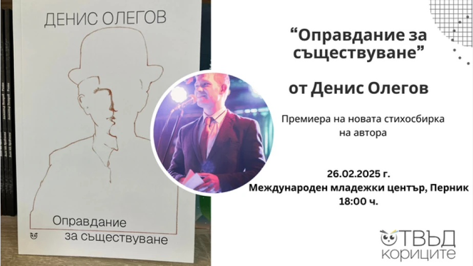 Денис Олегов представя новата си стихосбирка „Оправдание за съществуване“ в Перник. Книгата е първа за новото издателство „Отвъд кориците“ и засяга теми като смисъла на живота, стремежа да бъдем по-добри, преодоляването на трудностите и страховете. Духовните ценности и себепознанието са в центъра на търсенето на отговорите на въпросите, които ни вълнуват всеки ден.