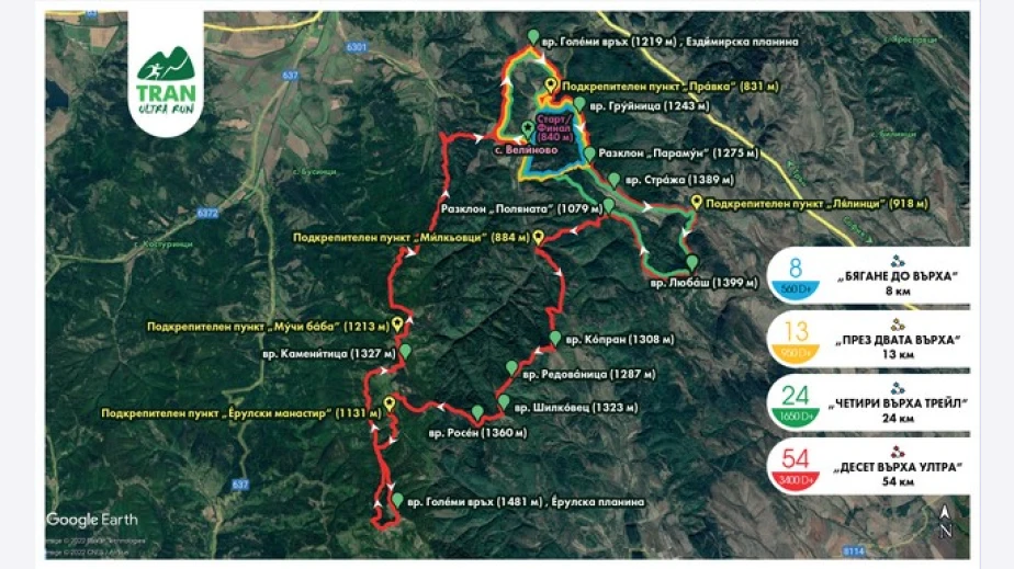 Остават 10 дни до края на регистрацията на третото издание на състезанието по планинско бягане Трън Ултра Рън 2024. Инициативата, организирана от Трънското туристическо дружество и подкрепено от община Трън, ще се проведе на 11 май 2024 г. със старт и финал в с. Велиново, община Трън.