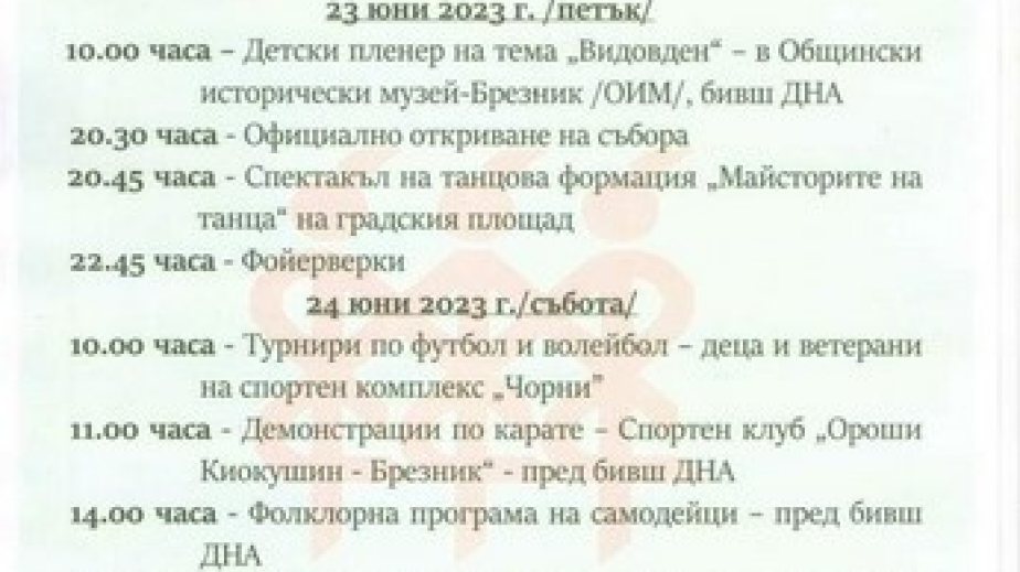 Граовският събор Видовден ще бъде официално открит на 23 юни (петък) в Брезник със спектакъл на Танцова формация "Майсторите на танца", съобщиха от общината. В същия ден, в сградата на Общинския исторически музей в града, ще се проведе и детски пленер посветен на празника.