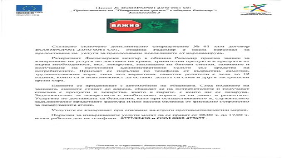 Разкритият Диспечерски център в община Радомир приема заявки за извършване на услуги по доставка на храна, хранителни продукти и продукти от първа необходимост, включително лекарства, заплащане на битови сметки, заявяване и получаване на неотложни административни услуги със средства на потребителите. Приемат се поръчки по телефона от възрастни, самотни, трудноподвижни хора, лица под карантина, самотни родители с деца до 12 години, които са в невъзможност да оставят децата си сами и други застрашени групи хора.