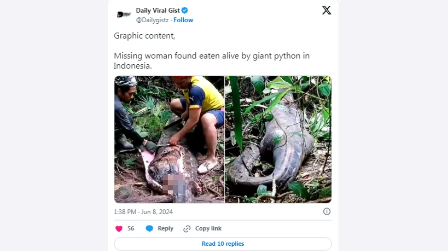 Мъжът на изчезналата жена станал подозрителен, след като забелязал "много големия" корем на питона. След това той повикал селяните да му помогнат да отвори стомаха на змията, където било открито тялото на съпругата му.