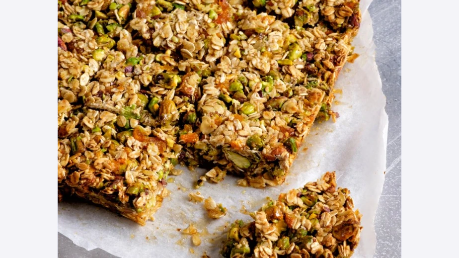 Смесват се шамфъстъкът, тиквените семки, кайсиите, слънчогледовите семки, лененото семе, овесените ядки и канелата.
