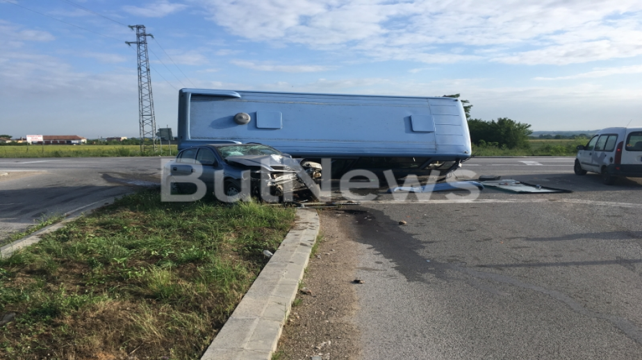 Той е бил ударен странично от друг автомобил, в следствие на което автобусът се обръща върху леката кола. При обръщането вратите на превозното средство са останали блокирани и пътниците се е наложило да излизат през прозорците.