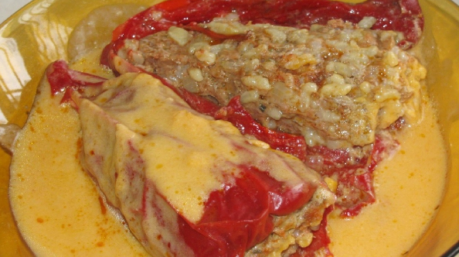В тиган загряваме мазнина и запържваме до златисто нарязаните на ситно лук, чесън, моркови и чушката. Слагаме каймата да се запържи. Прибавяме ориза. Прибавяме червен пипер и доматено пюре, овкусяваме със сол, чубрица и магданоз.Махаме семките от чушките (избушваме ги) и ги пълним с готовата плънка. Подреждаме чушките в тавичка и заливаме с топла вода, колкото да ги покрие до половина.Печем пълнените чушки около 40-45 минути във фурна, загрята на 180 градуса.Приготвяне на соса:Разбиваме яйца с кисело мляко и добавяме брашно. Наливаме бульона от печените чушки при яйчената смес, като разбъркваме непрекъснато.Сервираме чушките заляти с няколко лъжици от соса.