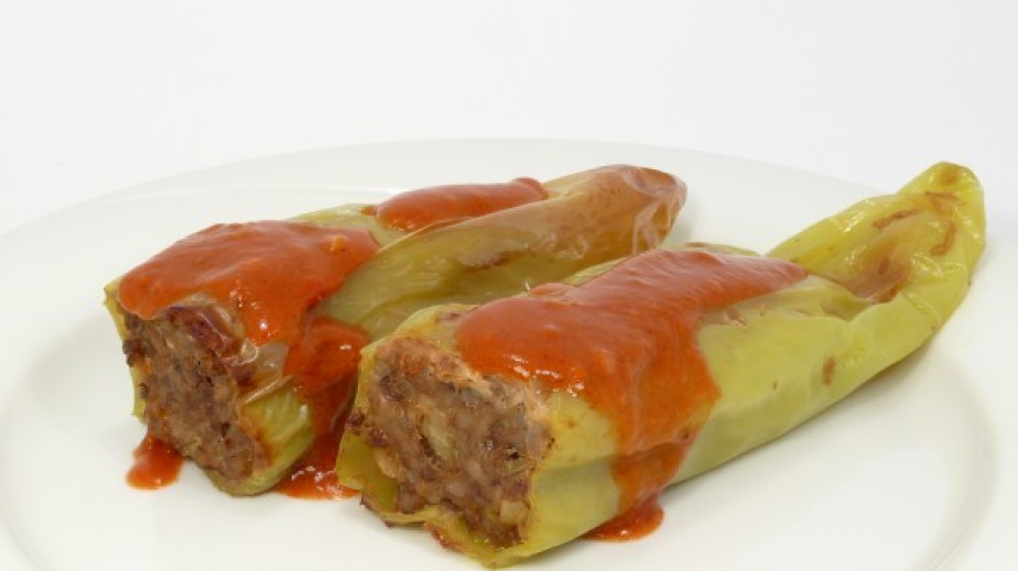 Почистете чушките от дръжките и семето. Нарежете лука на тънки филийки, отделете малка част, а останалата запържете в олиото.Прибавете оризът с малко сол и покрийте с вода. Когато водата поеме, оставете ориза настрана, за да се охлади. Прибавете каймата към ориза и посолете, подправете с черен пипер.С получената смес напълнете чушките. Запечатайте отворите им с брашно. В подходяща тенджера се нареждат напълнените чушки, заливат се с доматения сок и се сваряват.Прибавете отделения лук и листата целина. Захлупете с капак и оставете на умерен огън около 50 минути, след което сосът от варенето се отцежда или се вадят чушките.В отделен съд пригответе запръжка от маслото и брашното и се разрежда с отцедения сос. Подправете със захарта. След това залейте чушките със соса и се оставят на огъня още около 10 минути.