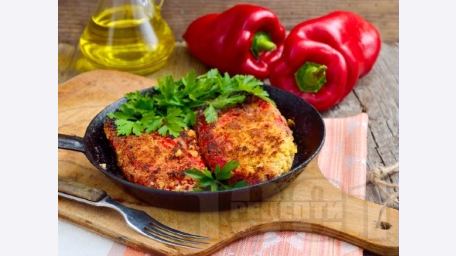 Половината от яйцата с еразбивта с вилица и се смесват с натрошеното сирене. С получената плънка се напълват подсушените печени белени червени чушки.