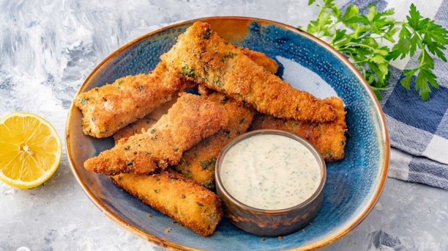 Извадете рибните късчета в чиния върху кухненска хартия, за да попие излишната мазнина. Сервирайте с млечния сос.