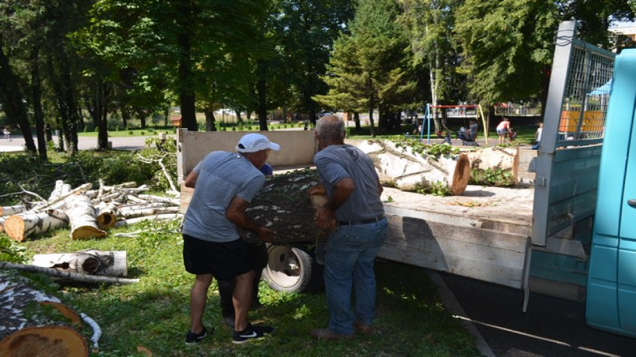 Междувременно, продължава огледът за опасни дървета и почистването от сухи клони, който се извършва от служители от отдел "Общинска собственост, екология и гори" в Общинска администрация - Радомир. Работници вече започнаха да извозват премахнатите дървета и клони.