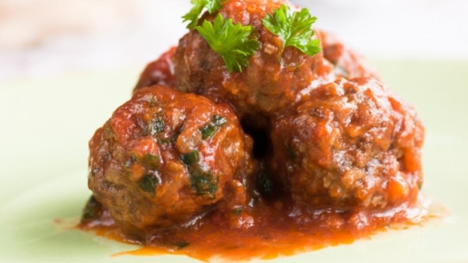 Разбъркайте смляното телешко месо в купа заедно с яйцето, накълцания ситно лук, хляба, кимион, сол, черен пипер на вкус.Оформяйте малки кюфтета от сместа и ги пускайте да се изпържат по стандартния начин в сгорещената мазнина.Подредете изпържените кюфтета в чиния.Сложете нарязаните ситно домати от консерва в малка тенджера заедно с чесъна, сол, черен пипер и ригана. Гответе соса на умерен котлон до сгъстяването му. Залейте кюфтетата с доматения сос и поднесете.