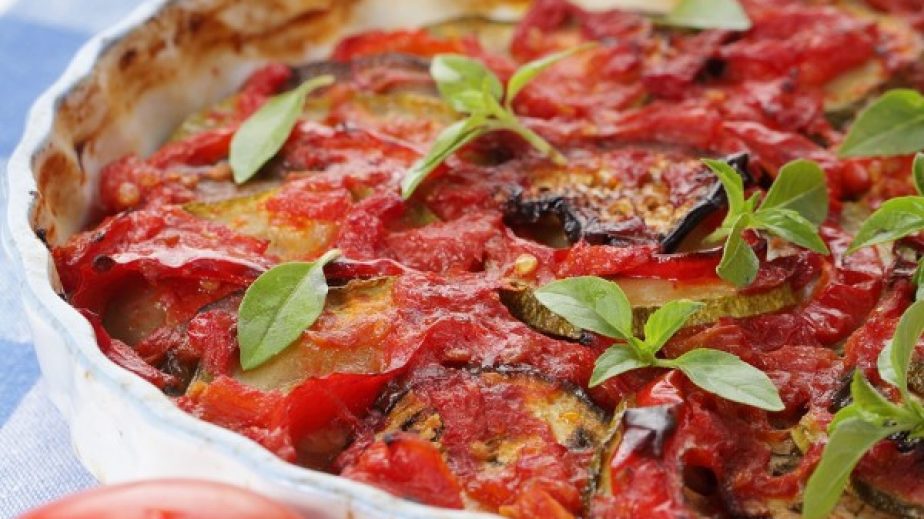 Патладжаните се измиват, нарязват и се посоляват, след което се оставят да престоят 30 минути, за да се отцеди горчилката.След това се измиват и подсушават. Червените чушки се изпичат и белят. Нарязват се на дребни кубчета и се смесват с предварително настърганите домати, нарязаните магданоз и босилек.Смесват се черният пипер, олиото, счуканият чесън, риганът и солта. Разбъркват се много добре и се добавят патладжаните. Зеленчуците трябва да престоят в тази марината час, два.След това се поставят в намазнена тавичка и се заливат с доматената смес. Пече се в силно загрята фурна на 200 градуса до пълна готовност.