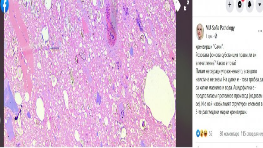 Изключително интересeн експеримент проведоха преподаватели и студенти от катедрата по патология на Медицинския университет в София. Докторите направиха "аутопсия" на някои от най-популярните марки кренвирши на пазара - "Тандем", "Народни", "Житница", "Кен" и "Сачи". С уточнението, че нито един от продуктите не представлява опасност за човешкото здраве, откритите в тъканта на колбаса структури са крайно интересни, пише Lupa.bg
