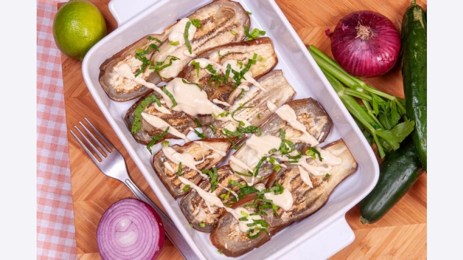 Първата стъпка от рецептата за печени патладжани с таханов сос е приготвянето на патладжаните. Избирате леки патладжани, който се усещат по-въздушни. Колкото по-тежки и плътни са, толкова по-голяма е вероятността да имат голяма твърда част със семки, което ги прави трудни за приготвяне. Патладжаните измивате, отрязвате дръжката и нарязвате на филийки по дължина, или пък на колелца.