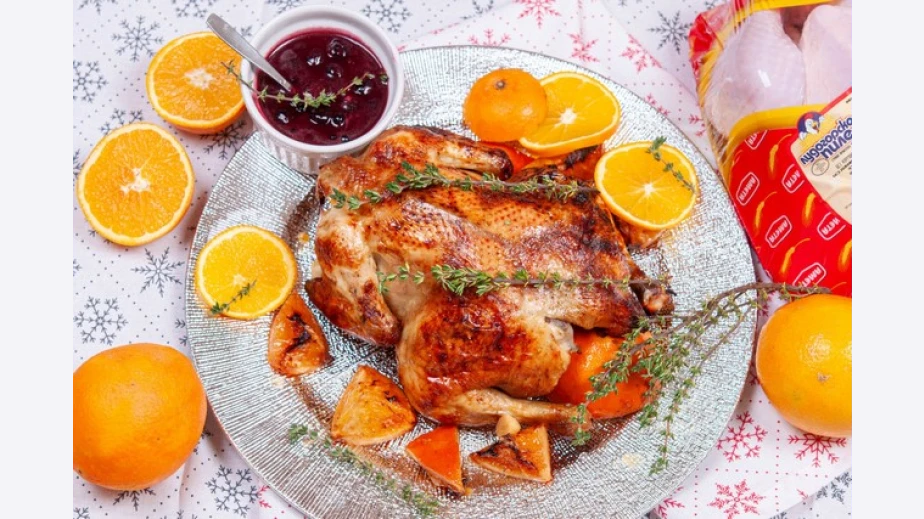 Първата стъпка от рецептата за цяло пиле с портокали и боровинков сос е подготвката на пилето. Кравето масло трябва да е меко, оставено на стайна температура. Измивате пилето, подсушавате го и го обтривате добре отвън, но и отвътре с мекото краве масло, солта и черния пипер. Измивате, след което разрязвате 2 портокала на четвъртини, почиствате и скилидките чесън. Слагате в пилето 1-2 скилидки чесън, парчетата портокал и един стрък мащерка.