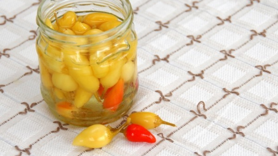 Почистете дръжките на лютите чушлета и ги изпечете. Смесете продуктите за маринатата и варете 10 минути.Започнете да редите чушките в бурканчета, като по средата слагайте нарязани на дребно чесън и копър.Залейте в бурканите горещата марината, затворете ги с капачки плътно и ги обърнете надолу, докато изстинат.