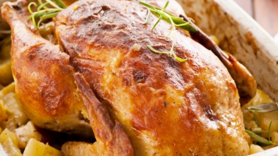 Поставете парченца сланина на дъното на тавичката за печене, а отгоре сложете пилето.Наоколо подредете нарязаните картофи и печете в слаба фурна.По време на печенето поръсвайте пилето и картофите с разтопено масло.