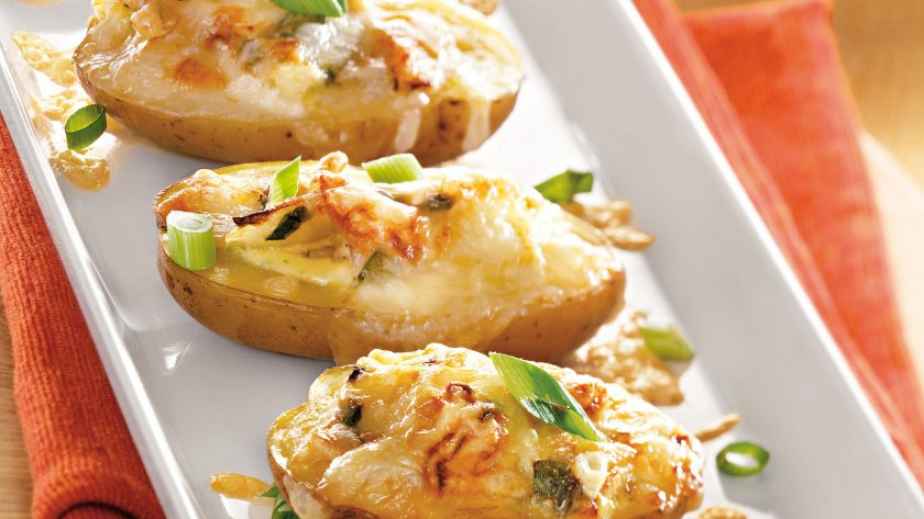 Изпечените картофи се разполовяват по дължина и леко се издълбават. Върху половинките се разпределя плънката с гъбите.