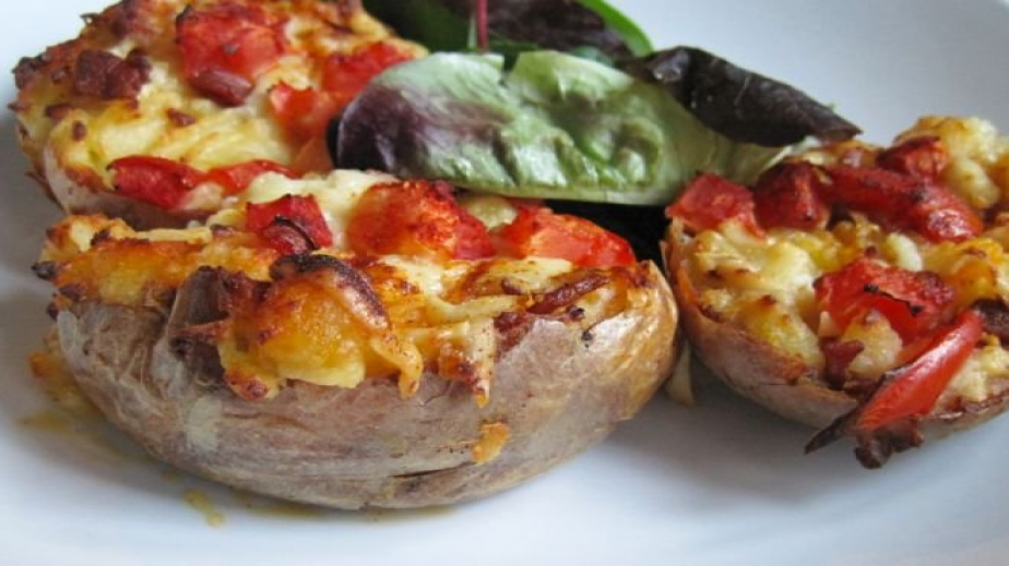 Сложете картофите в тава с незалепващо покритие. Върху всеки капнете малко олио и посолете. След това обтрийте добре картофите, за да се овкусят от всички страни. Поставете на тавата алуминиево фолио и я сложете в предварително загрята на 200 градуса фурна, за да се запекат картофите. След това внимателно разрежете картофите наполовина и във всеки поставете парченце моцарела, върху нея малко песто и нарязани наполовина чери доматки. Овкусете със сол и черен пипер. Завийте всеки картоф много добре в алуминиево фолио. Върнете картофите във фурната за още 10-15 минути.