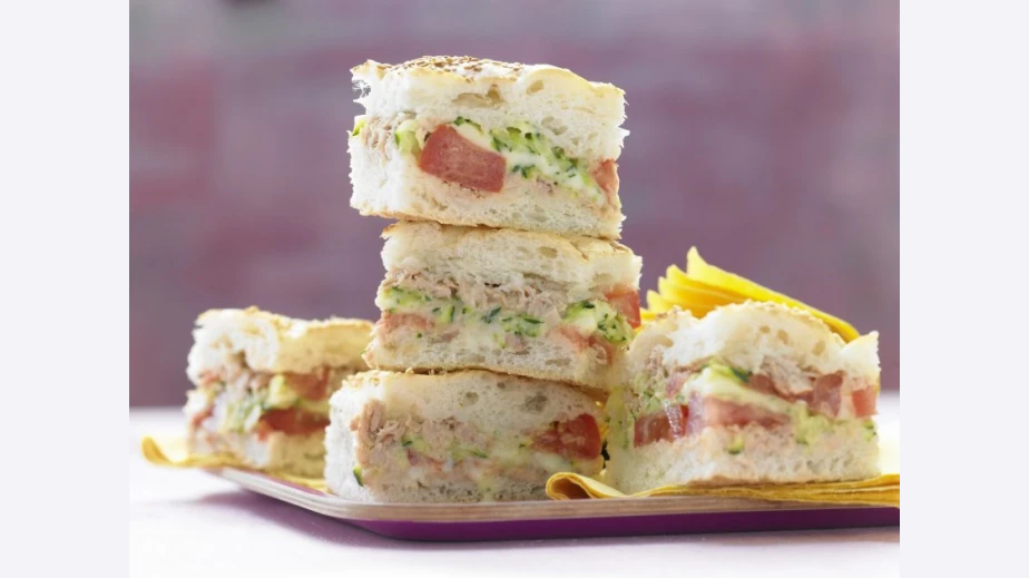 Хлябът се разрязва на две хоризонтално. Рибата тон се намазва върху двете половини.