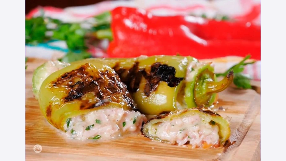Салата от печени чушки и орехи върху краставица