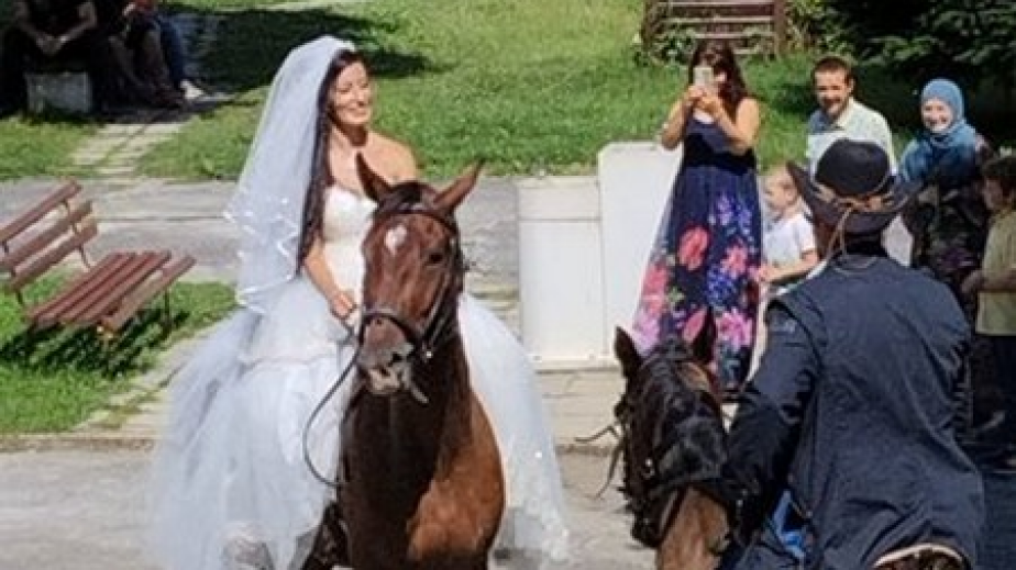 Булка пристигна в кметството на смолянското село Смилян, яздейки кон. Облечена в класическа булчинска рокля и с развят воал, булката премина през цялото село, яхнала красивото кафяво животно. По същия начин до ритуалната зала на кметството пристигнаха младоженецът и кумовете, съобщава Лупа.бг.