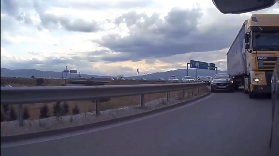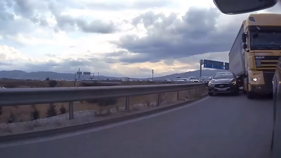 Той е качил и регистрационните номера на автомобила и камиона. На клипа се вижда как тежкотоварната машина задира колата, която се налага да се доближи максимално до мантинелата, за да не бъде смачкана.