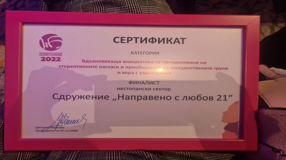 Пернишкото сдружение „Направено с любов 21“ получи престижно отличие. Неправителствената организация получи приз в категория хора с увреждания по време на връчването на Националните награди на Съвета на жените в бизнеса в България за вдъхновяващи постижения за разнообразие, равнопоставеност и приобщаване. Той е за вдъхновяваща иницатива за преодоляване на стереотипните нагласи и приобщаване на малцинствените групи и хора с увреждания.
