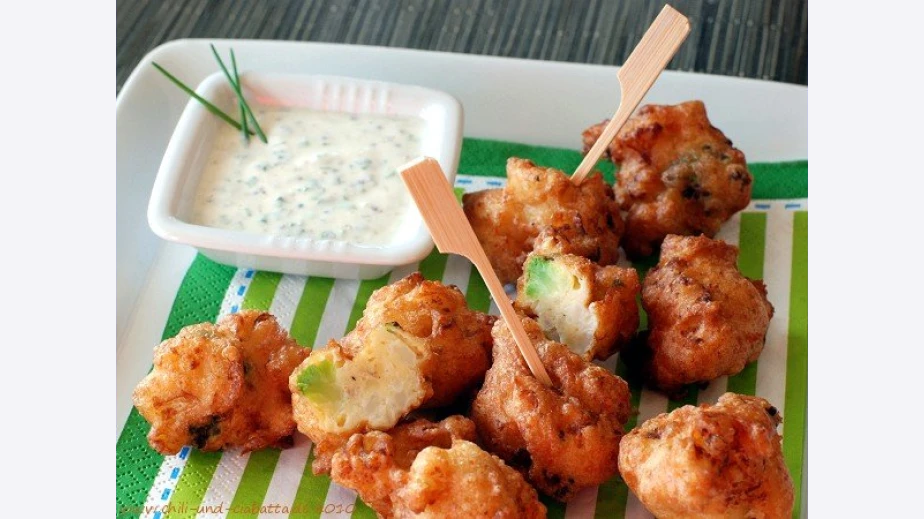 Сервират се с млечен дип, приготвен от смесените кисело мляко, заквасена сметана, горчица и наситнен зелен лук.