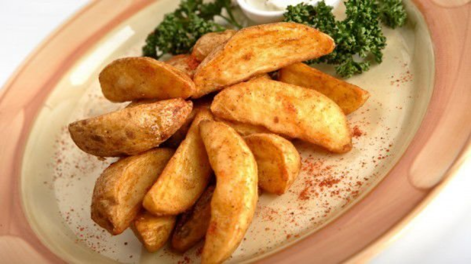Картофите се измиват много добре с топла вода и се нарязват по дължина, на дебели парчета, без да се белят. В тавата, намазана с олиото, която ще се използва за печене, се смесват всички подправки и картофите се овалват в микса. Пекат се в добре загрята на 200° фурна за 30 минути, докато се зачервят и се получи хрупкава обвивка. Сервират се като предястие или основно ястие, комбинирано със салата, приготвено месо или сос./Рецепта на 1001recepti.com